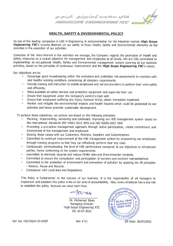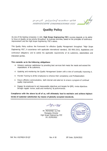 This Quality Policy outlines the framework for effective Quality Management throughout “Highscope Engineering FZC” in accordance with applicable international standards, ISO 9001:2015, legislation, and contractual obligations, and to satisfy the applicable requirements of its customers, stakeholders, and interested parties.